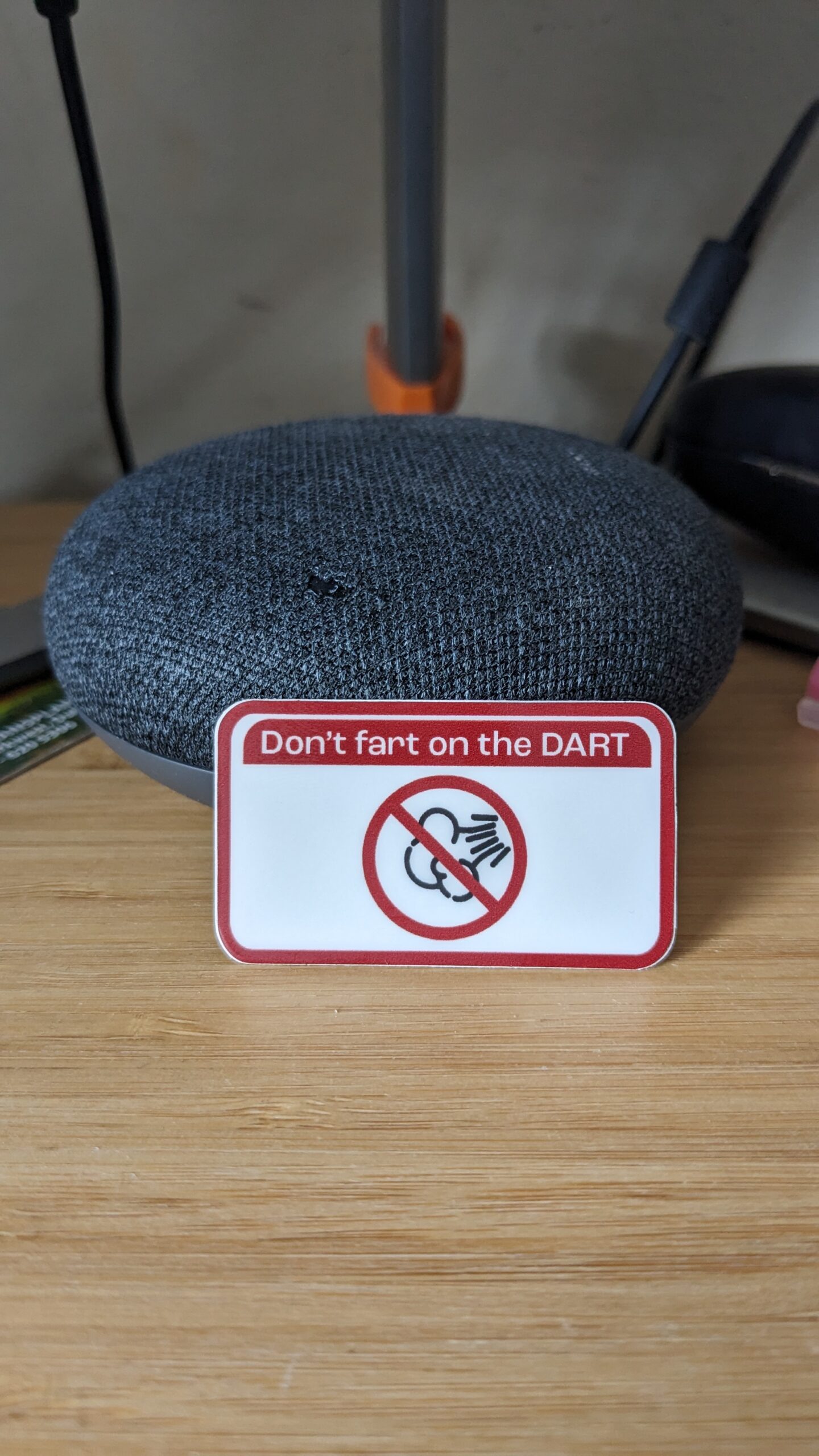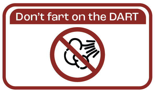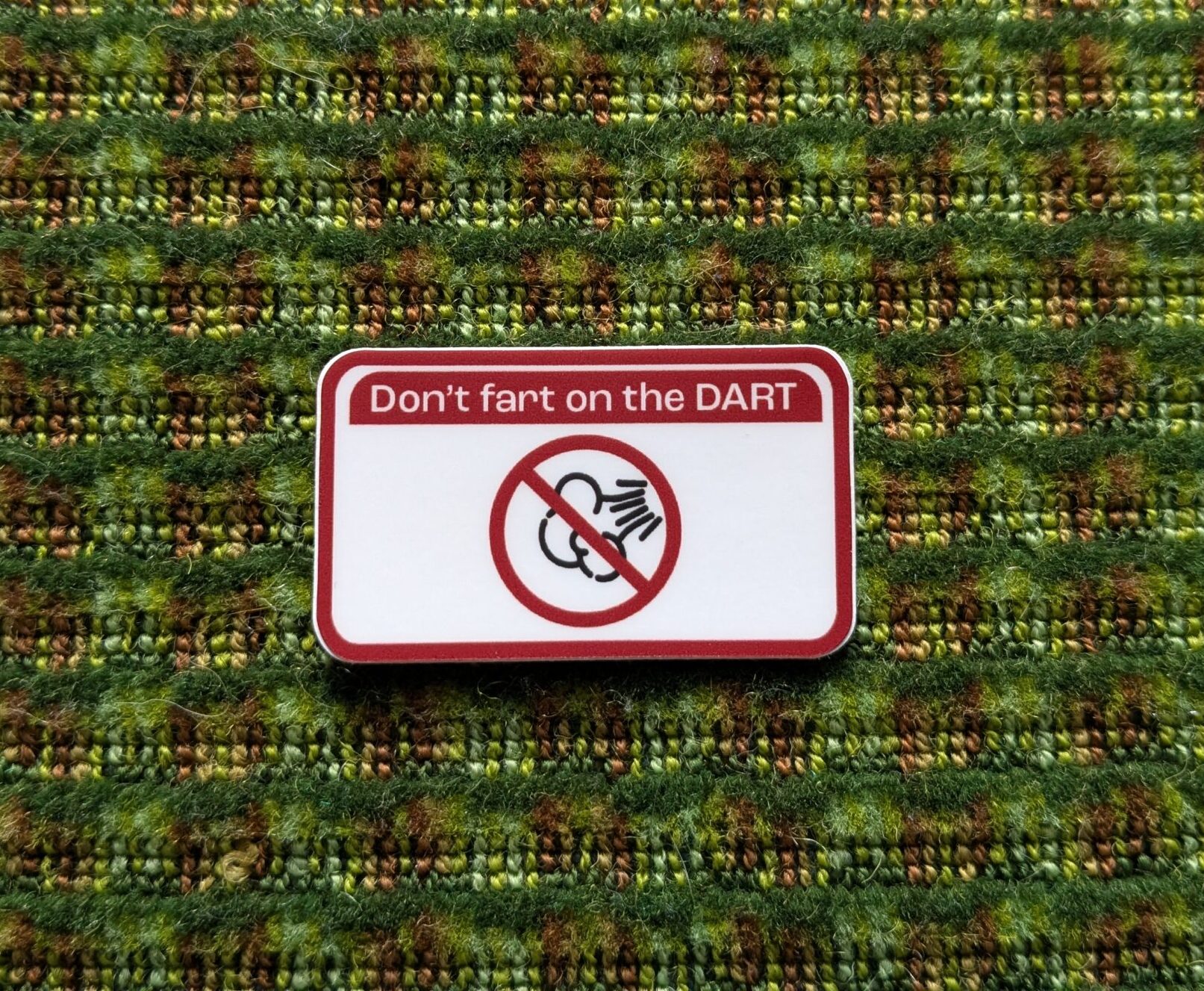 “Don’t fart on the DART” sticker, a fresh take on the ‘no feet on seats’ window signage. This sticker is 5cm x 2.9cm.