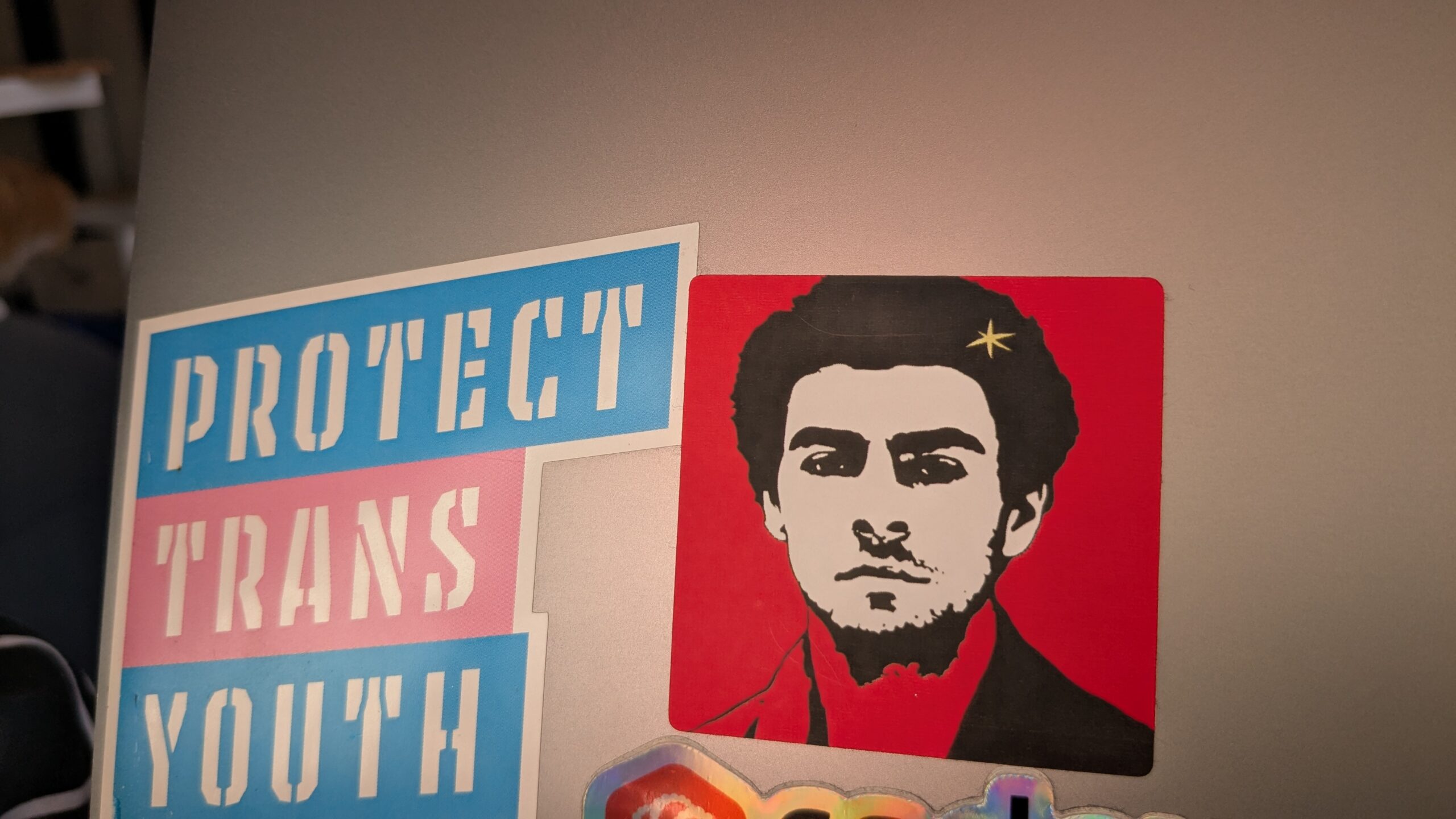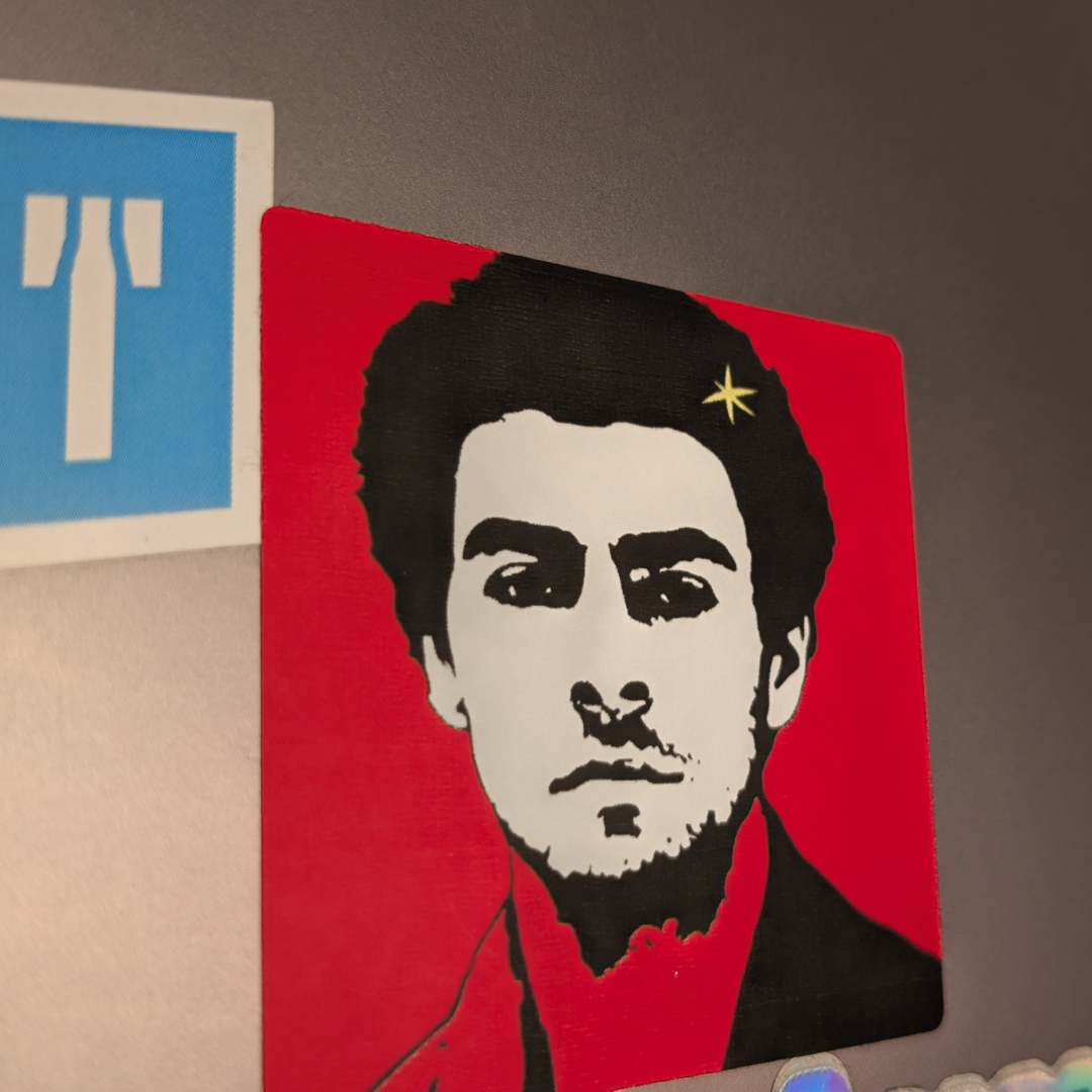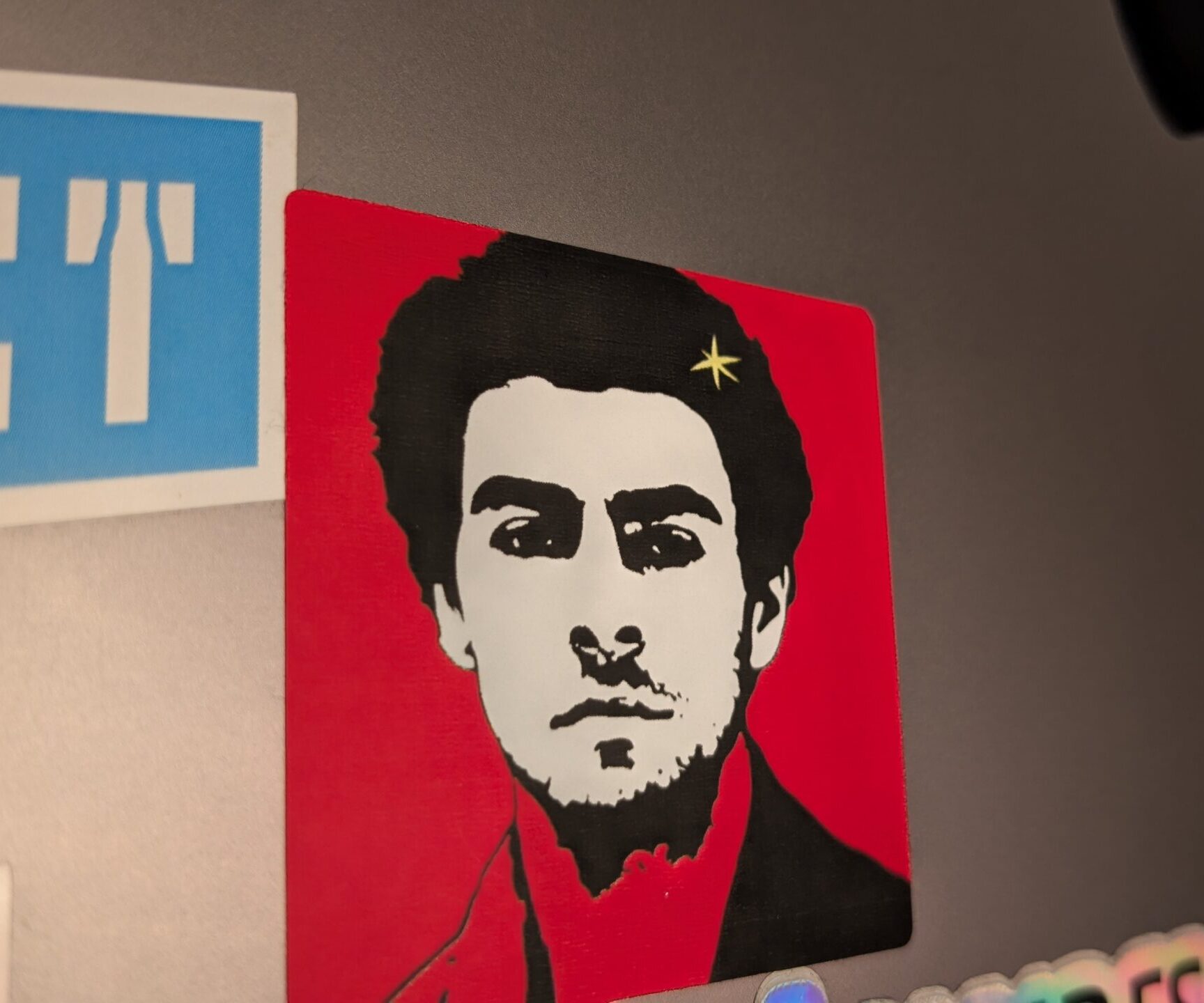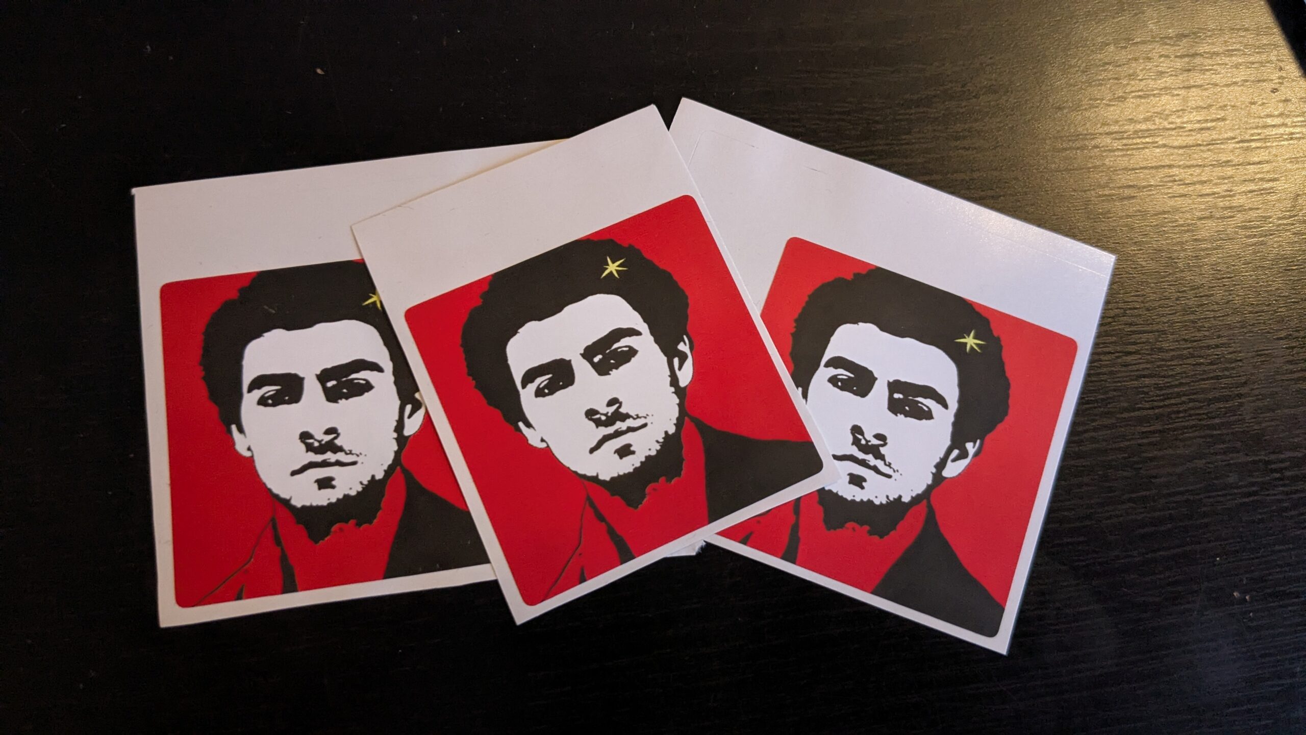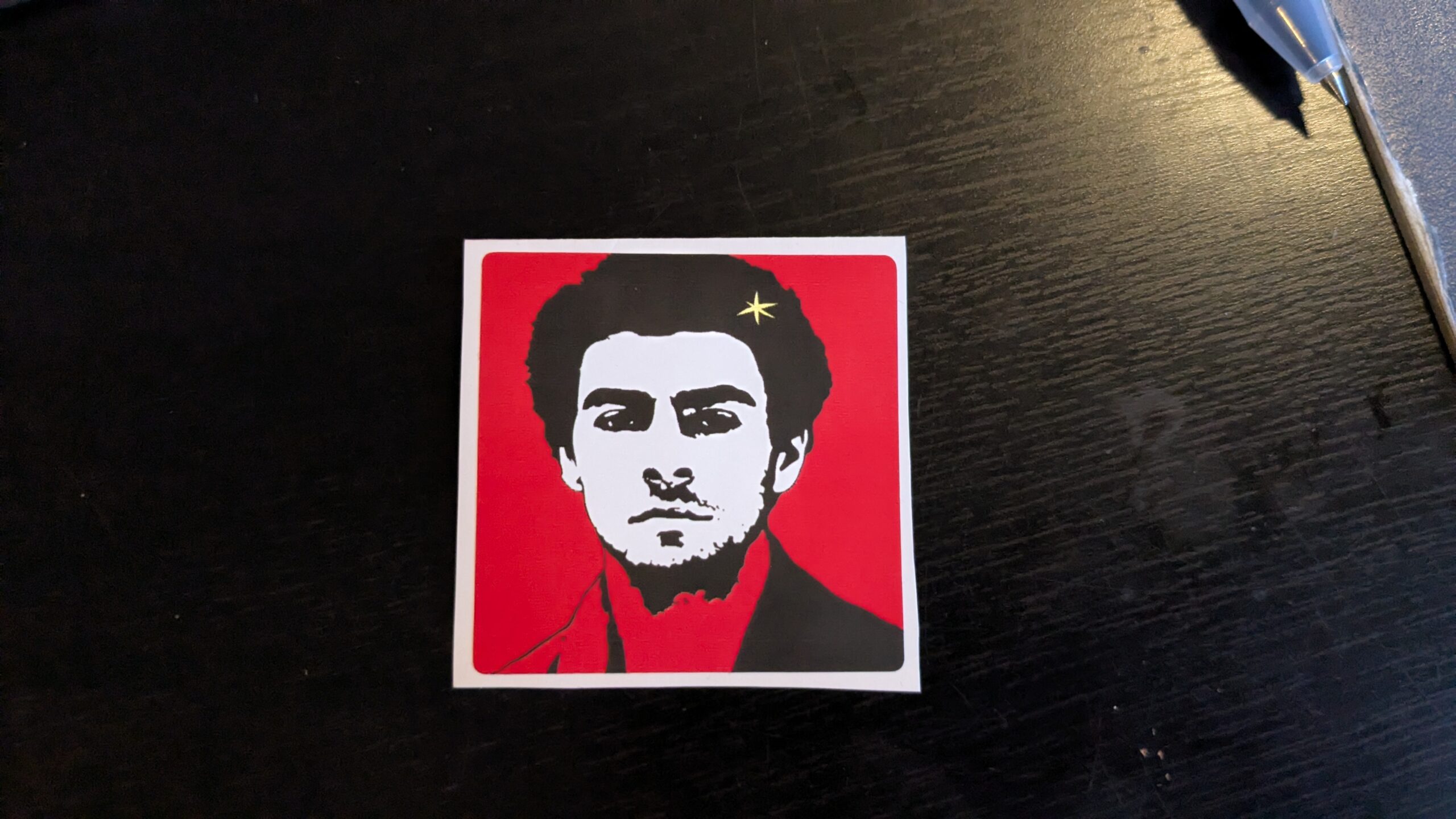 Envisioning Luigi Mangione as a revolutionary in a time of political stress. This sticker is 50 mm × 50mm in size. Warning, profits may be spent on socialist activities.Â