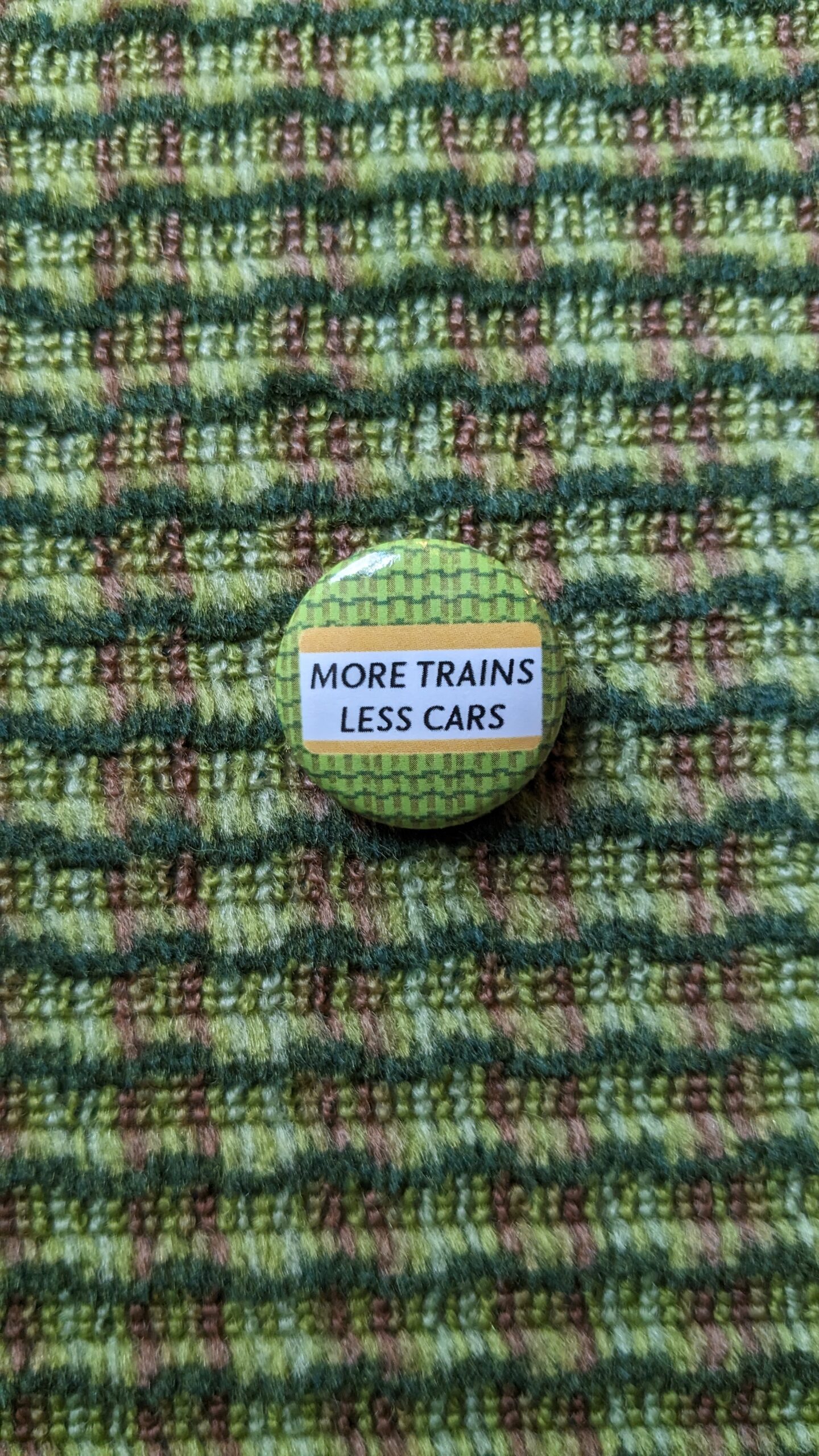“More trains, less cars” pin badge in the style of a train ticket sitting on a DART seat.