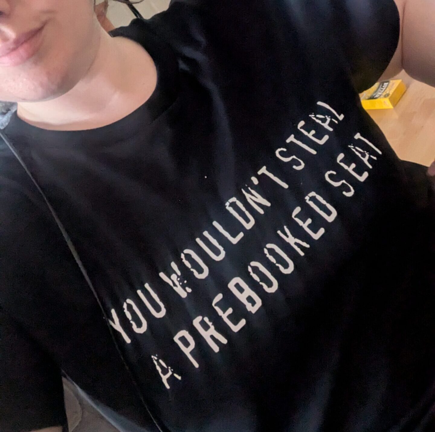 You’ve booked your train home, your favourite window seat, ready for a nap, and yet again someone’s stolen your prebooked seat! You’re fed up asking people to move or staring them out of it, why not let your t-shirt do the talking for you?